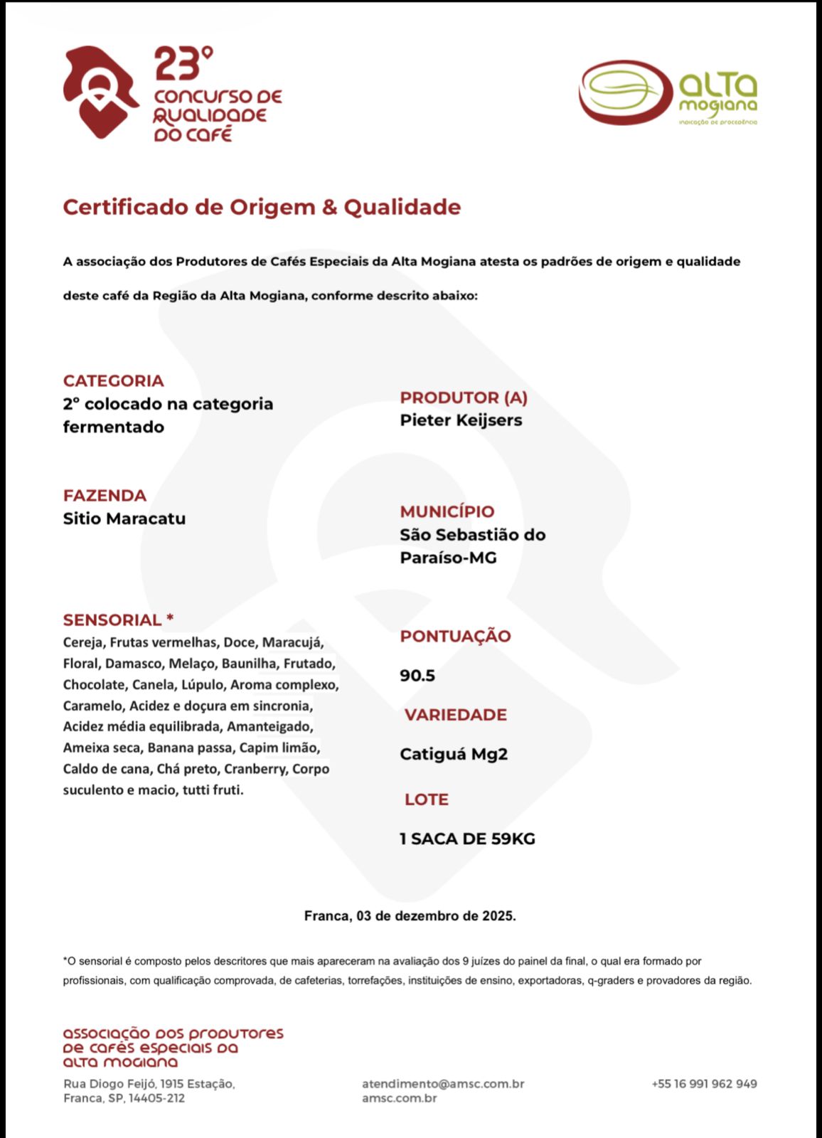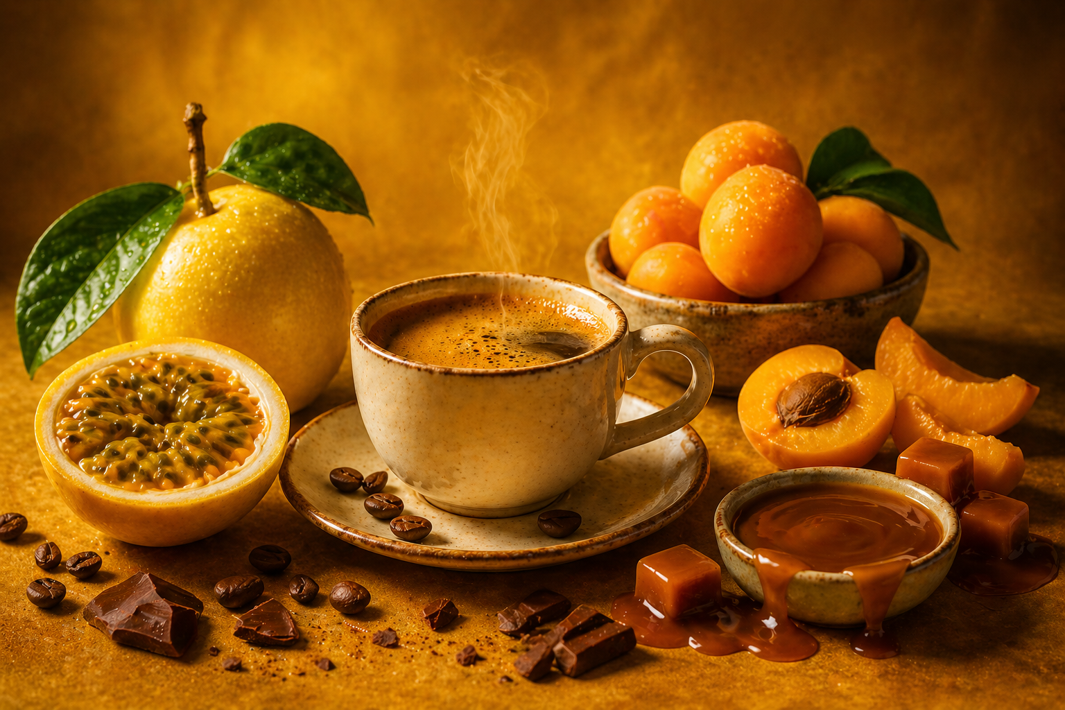 Notas Sensorais: Maracujá, Damasco, Frutas Amarelas, com corpo suculento, amanteigado e refrescante