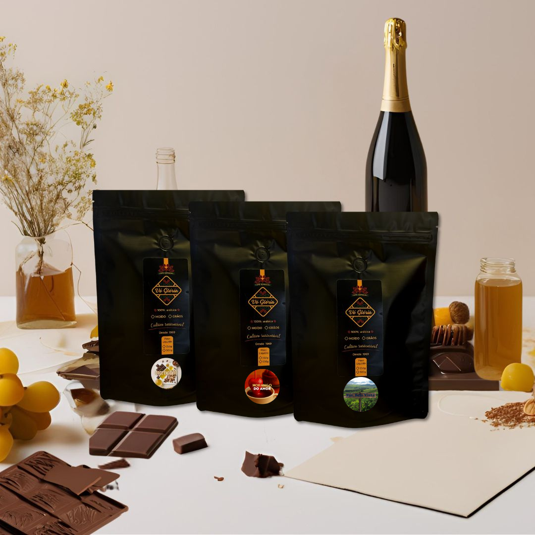 Descubra o Kit Vó Glória Especiais, que apresenta quatro opções de café torrado moídos e embalados em 250 gramas cada, perfeito para quem deseja variedade à disposição!
